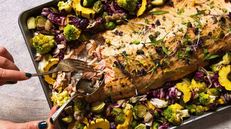 If you enjoy cooking, then you probably love those days when you have hours to spend in the kitchen making elaborate dishes from scratch, really taking your time and enjoying the process. But if you're like most of us, you don't have time to do that kind of cooking on a daily basis. Most of the time, it's just about making a meal that will fill you up relatively quickly and getting on with the rest of your day. You shouldn't have to sacrifice taste for ease, though, which is why these sheet pan recipes should be on your must-make list.