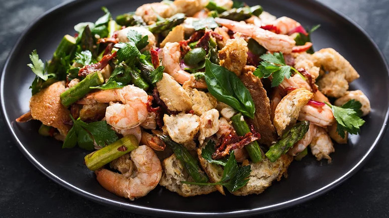 Shrimp is one the lightest, most versatile types of seafood out there, which is why we like to work it into our weekly meal rotation as much as possible. There's perhaps no easier way to do that than with this recipe for Sheet Pan Shrimp and Vegetables. The shrimp is cooked and served with a warm salad containing asparagus, artichoke hearts, olives, red onion, and sundried tomatoes, all made more hearty with torn sourdough bread for a sort of panzanella-adjacent situation. It may just be one of the best ways to prepare a seafood-centric dish for a busy weeknight.