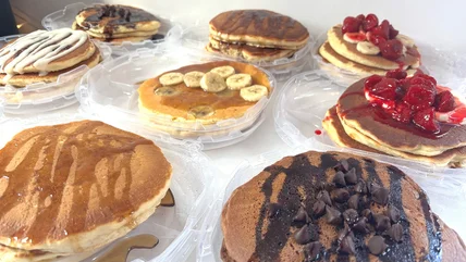 As you can probably tell from the photo, the "chocolate chocolate chip" pancakes aren't so chocolatey that you'll be hard-pressed to take more than a few bites. Personally, I'm a fan of ultra-dark chocolate, but I liked these too. The addition of a scant amount of chocolate in the pancake batter gave it some flavor. If you recall, my biggest problem with the OG pancakes was that they were pretty flavorless — you won't have that issue with these pancakes. They also came with chocolate sauce and extra chocolate chips on top. I could give these a tied ranking with the previous choice; they're coming in ahead purely because of my own tastes on this particular day.