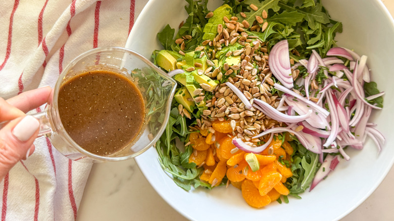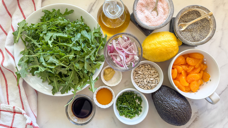 - Add the arugula, red onion, chopped chives, mandarin oranges, avocado, and toasted sunflower seeds to a large bowl.