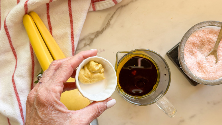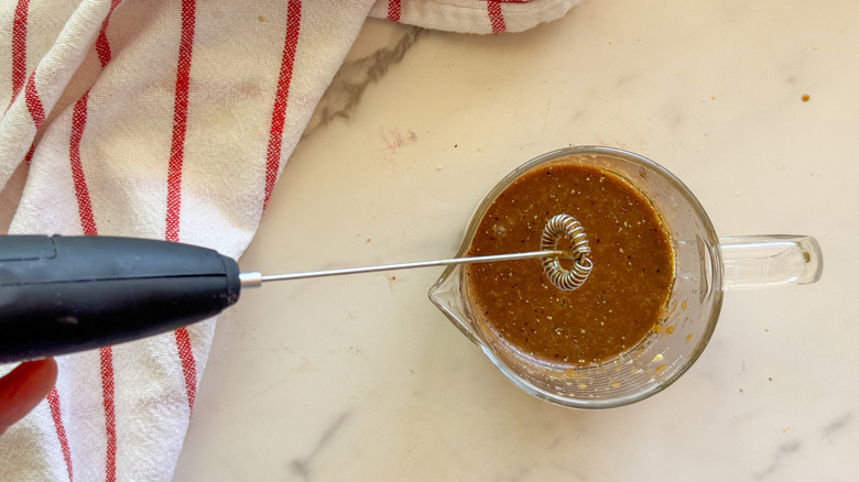 - In a jar, add the olive oil, vinegar, lemon juice, Dijon mustard, syrup, salt, and pepper.
