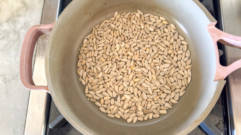 - Add the sunflower seeds to a pan over medium heat for 5 to 8 minutes, until toasted.