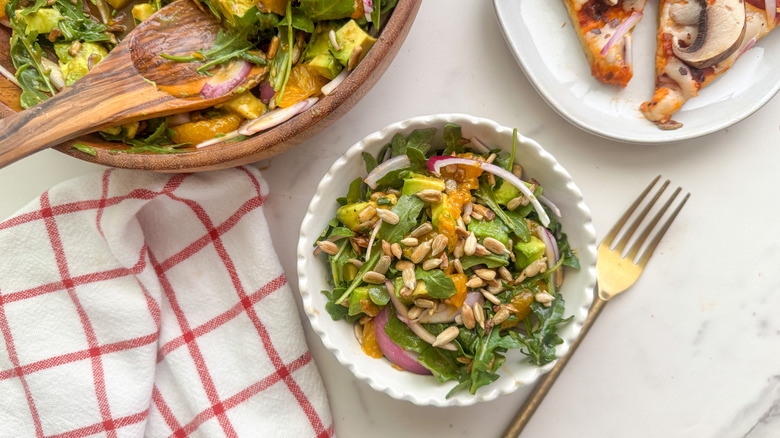 Pizza night is good, but pizza and salad night is better. There's nothing better than fresh, crisp greens to lighten up a heavy meal, especially if those greens are bright and flavorful. This citrusy arugula salad plays off of the peppery greens by pairing them with juicy and sweet mandarin oranges, crunchy toasted sunflower seeds, and creamy avocado, providing a delicious and light bite full of different textures. The lemon and balsamic dressing is bold and tangy, and might just make this salad steal the show.