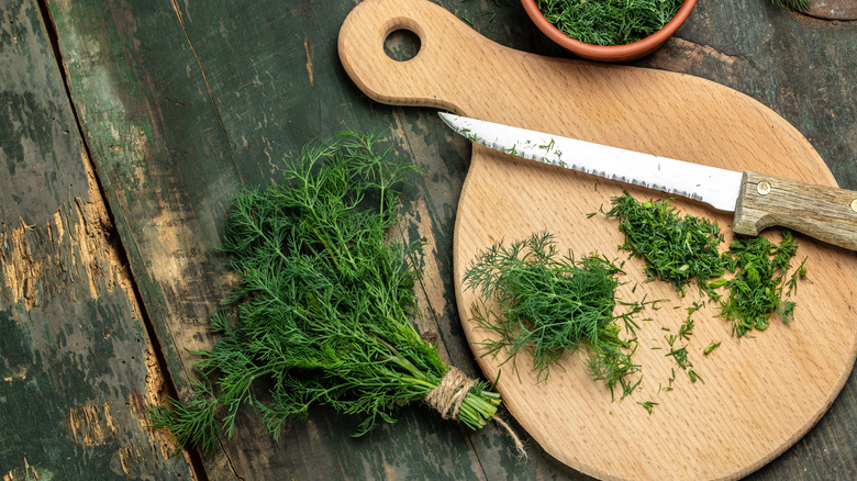 Most recipes for homemade tartar sauce feature dill, a flavorful herb with a subtly citrusy, grassy taste. However, browse the ingredients list on a store-bought version, and you won't always find this herb listed. That's why adding some fresh chopped dill is always a great idea. This touch of freshness can boost the sauce's flavor profile pretty dramatically, giving it a new lease of life whilst adorning it with appealing speckles of green. Start by pouring about half a cup of store-bought sauce into a bowl, and adding a tablespoon of finely chopped dill. You can of course adjust this to taste as you please.