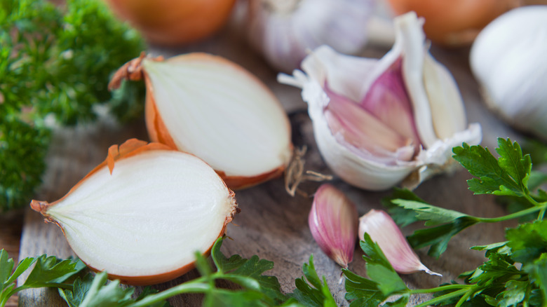 To pack some aromatic goodness into a basic store bought sauce, reach for those humble recipe staples — onion and garlic. Both are fantastic for injecting some savory depth, that complements and brings out the flavors of the other ingredients wonderfully. To add onion, you'll need to mince it finely first. This will allow it to unleash as much flavor as possible once added to the sauce, and won't leave you biting into any unwanted hefty chunks. You can either mince an onion by dicing it as finely as possible with a sharp knife, or tossing peeled and quartered onions into a food processor and pulsing into broken down into tiny pieces. About one tablespoon of minced onion should work well stirred into a cup of tartar sauce.