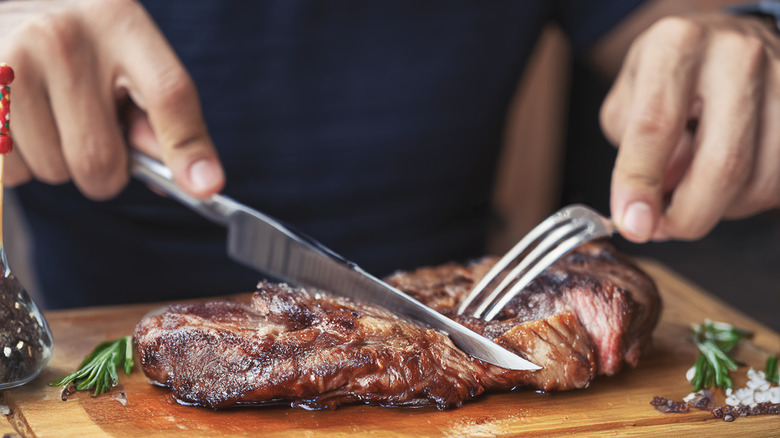 Apparently, Flay loves a good old-fashioned New York City steakhouse and the most quintessential items on the menu there. "Sometimes you just want that beautiful steak with creamed spinach and crusty potatoes and a great martini, and some shrimp cocktail — and a big, giant ice cream sundae," he told Parade, adding that this iconic NYC steakhouse meal is something he often craves. Flay is especially known for his mastery of meat, with entire shows dedicated to barbecue, so perhaps it's no surprise that steak stars in his dream meal instead of other NYC staples like pizza.