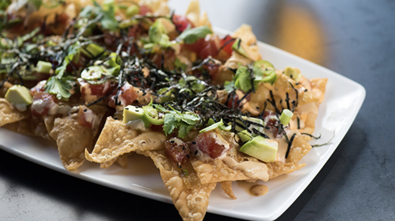 Along with the marinated raw ahi tuna, these nachos feature crispy wontons, green onions, avocado, serrano peppers, cilantro, sesame seeds, nori, sweet soy ginger sauce, sriracha aioli, and white truffle sauce, with the crispy wontons acting as the perfect vessels for these ingredients. They're beautifully crisp and stable enough to withstand the weight of all the components of the nachos and fried to resemble the signature shape of a tortilla chip.