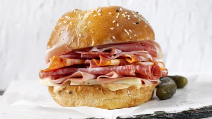 Practically synonymous with New York deli culture, pastrami is typically made with beef and is often served in thick stacks on rye. Similar to corned beef, pastrami differs from salami as it is first brined, then smoked and steamed. The taste and texture makes pastrami an ideal choice to swap with salami if you want to enrich your next sandwich with a more elevated flavor. Additionally, if your go-to style of salami is one made with beef, opting for pastrami will give you the beef flavor in a more tender format. You can also try a version of turkey pastrami for a leaner style of deli meat.