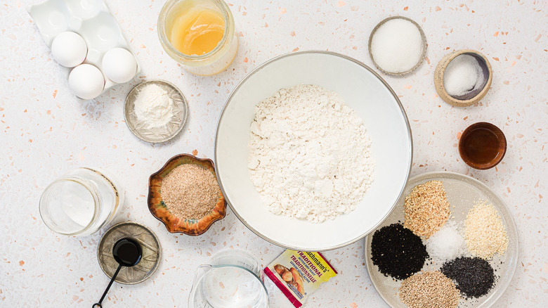 To make the bagels themselves, you'll need a good, high-quality gluten-free flour blend, psyllium husk powder, xanthan gum, salt, active dry yeast, granulated sugar, warm water, room-temperature large eggs, a neutral oil like grapeseed oil, and apple cider vinegar. For the poaching liquid, you'll want a large amount of water, your preferred honey, and baking soda. To make your own everything topping, grab white sesame seeds, black sesame seeds, poppy seeds, dried minced garlic, dried minced onion, and flaked sea salt.