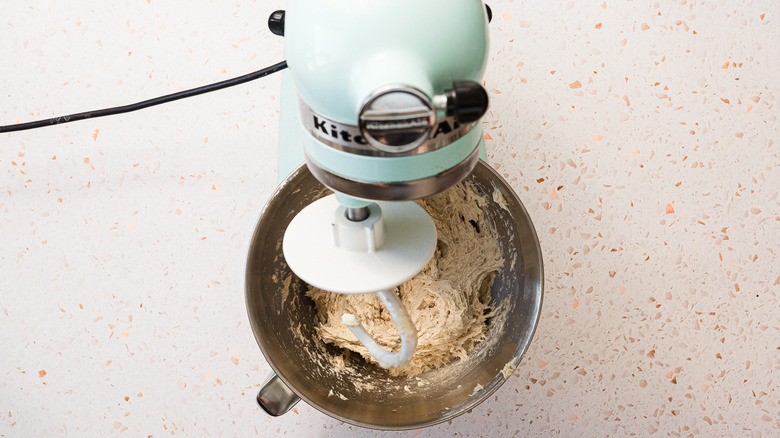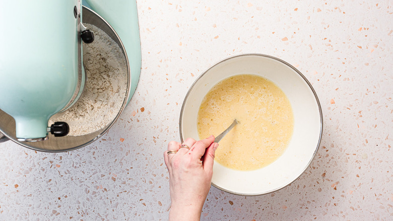 Gradually add the liquid to the dry ingredients with the mixer running at medium-low speed. Mix for 3 minutes until smooth and slightly tacky.
