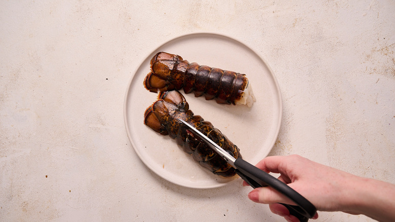 - Carefully cut the tops of the lobster tails down the middle to expose the meat, stopping just before the end.