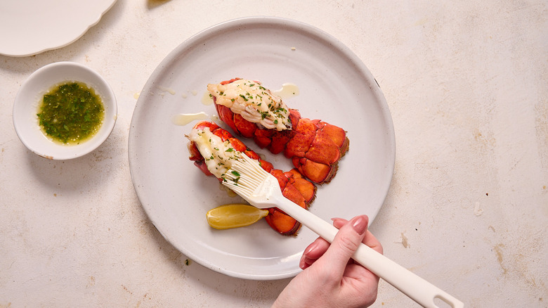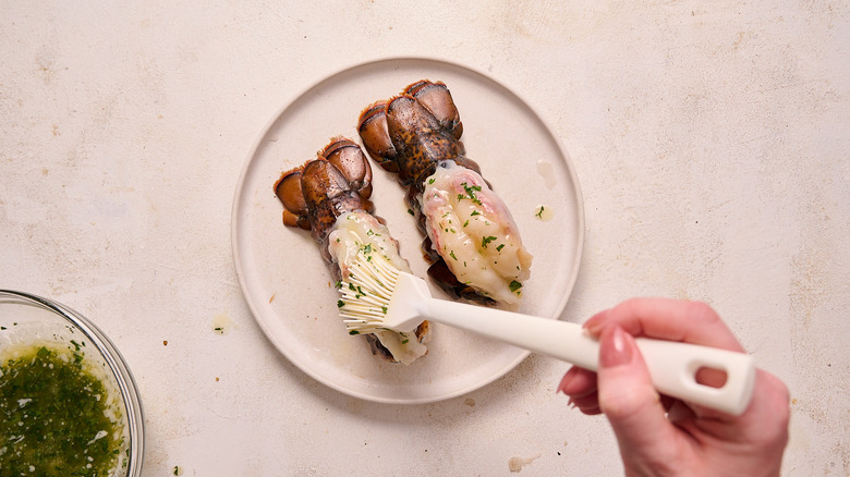 - Brush half of the butter mixture onto the lobster meat, reserving the other half for later.