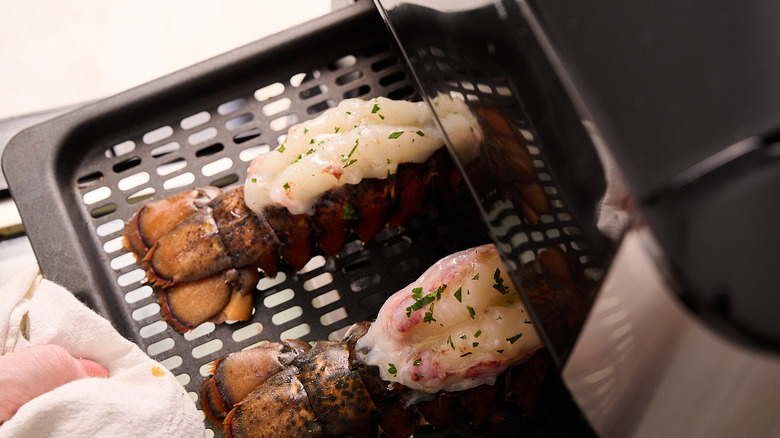 Before proceeding, ask the fish monger, check the label, or weigh your tail to find the correct weight and determine if the tail is small, medium, large, jumbo, or (lucky you) colossal. For small lobster tails weighing less than 6 ounces, adjust the cook time down to 3 or 4 minutes. For large, 8 to 10 ounce tails, adjust the cook time for a longer 6 to 8 minute period. For colossal, go just a touch higher and set the time for 8 to 10 minutes. Note that all air fryers cook slightly differently and preheat at different times — if you're not sure, cook at the lowest recommended cook time first and re-evaluate, adding a minute as needed.