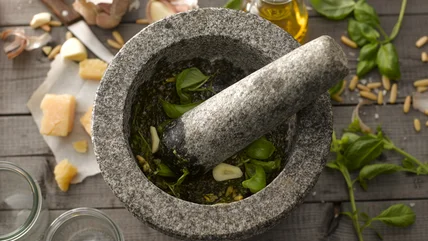 Some chefs swear by using the flat side of a cook's knife to crush and mash garlic, but this takes a little practice (and time, if you want to crush an entire bulb). Using a mortar and pestle doesn't require any culinary dexterity, and the process of randomly smashing the cloves releases their aroma and natural oils until you're left with a rough, pungent mass of goodness to toss into curries and other dishes. All you need to do is use the back of your ice cream scoop to bash your ingredients — anything from olives and basil to pine nuts and cumin — into smaller fragments.