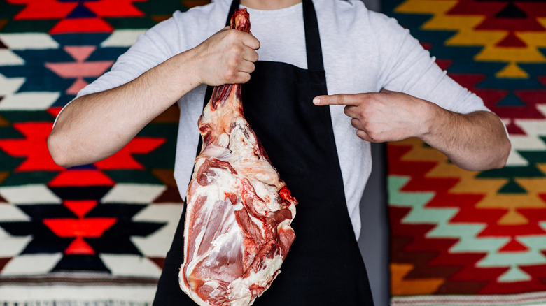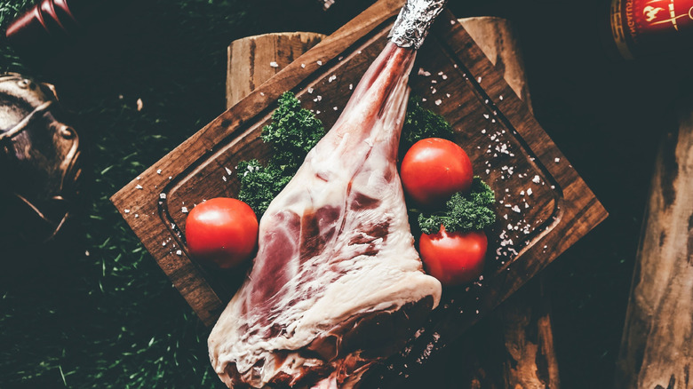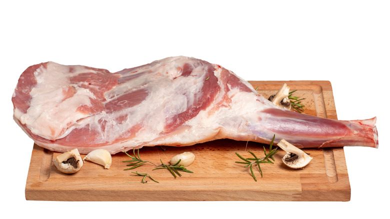 Beyond considering whether you want a bone-in or boneless cut, Ross also explains that it is important to pay attention to which location the leg of lamb came from. She says, "Shank end lamb legs are a bit more flavorful, but require slower cooking methods." Conversely, she notes that the sirloin side of the leg is a more tender cut, but that also means that the meat will be fattier. If you prefer your lamb to be extra tender, Joey Sergentakis offers an additional tip to help you choose the right leg of lamb. He says, "I also prefer a younger lamb; it will most likely be more tender."