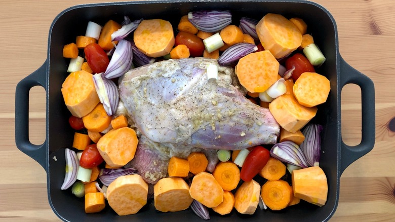 Leg of lamb isn't something that most of us cook just any old day. For many of us, it is reserved for special occasions, such as Easter, Christmas, and other holidays. For this reason, preparing it isn't second nature. And, unlike all of those chicken cooking hacks we've learned from repeated practice, we may feel at a loss when it comes to cooking a leg of lamb — and ensuring it turns out just right. Plus, it's not like a leg of lamb is the easiest recipe to prepare. There are, unfortunately, many things that could go wrong, potentially leaving you with a dry, tasteless, or simply unappealing meal to serve to your guests.