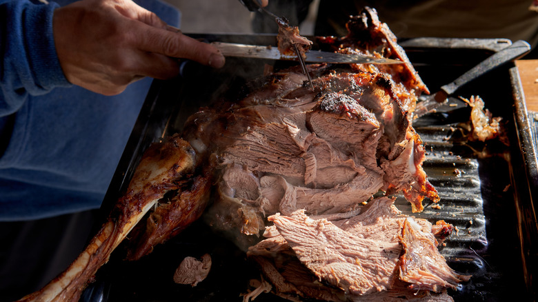 So, when you want to know how to cut a leg of lamb like a pro, it is crucial to slice it against the grain. Joey Sergentakis explains why this cutting direction matters so much. He says, "This shortens the muscle fibers, making each bite more tender." So, before you start cutting, the first step must be to identify the direction of the grain. "On a leg of lamb, the grain can run in different directions depending on the section, so I suggest taking your time to find the grain while carving," shares Sergentakis. To identify the grain, look for the muscle fibers. They should be a series of wispy lines that all go in one direction. Once you've identified this pattern on the leg, remember that you want to slice through all of those fibers, not in between them.