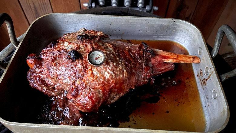 After that initial sear under the broiler, you'll need to lower the oven temperature. How much lower is the question. Jessie-Sierra Ross says, "Cooking temperatures and times really depend on the size, cut, and whether your lamb leg is bone-in or boneless." For a standard-size bone-in lamb, she recommends setting the oven to 325 degrees Fahrenheit. George Duran also sees a 325- to 350-degree oven as ideal. "Too low, and you'll be waiting forever while the meat dries out. Too high, and the outside might burn before the inside is fully cooked. A slow, steady roast is the key to juicy, flavorful lamb," he explains.