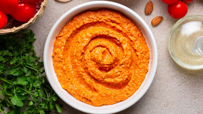 Although this may not be a super common combo, it's one that absolutely works. That relative lightness from the sauce plays well with fried fish, and its ultra-flavorful list of ingredients brings a basic fish recipe to life. You can always just dip the fish into the sauce if that sounds good to you, but if you want to make things look really fancy, spread some of that romesco sauce onto your plate before adding your fried fish on top. Then, whenever you flake off some of that fish, you can drag it through the sauce before eating it.