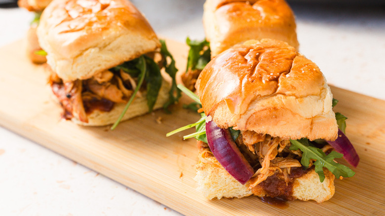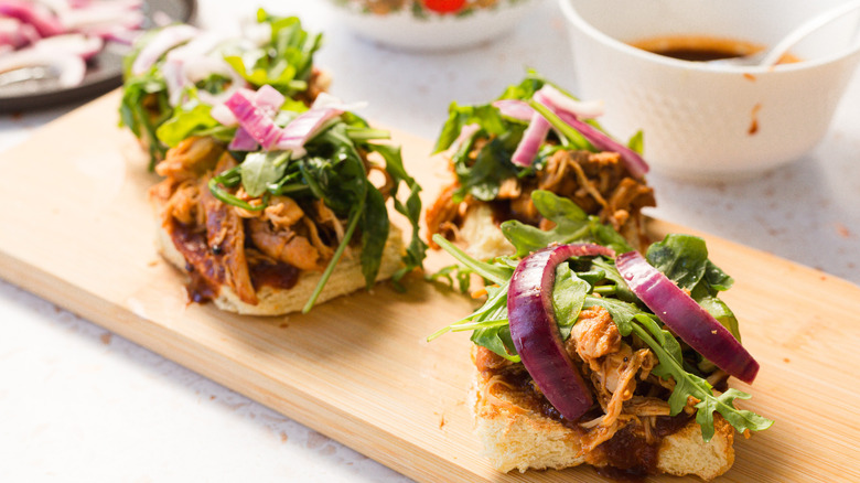 - To assemble the sliders, spread BBQ sauce on the bottom bun and top it with the chicken mixture, pickled onions, and dressed arugula. Finish with a top bun.