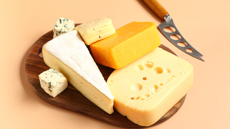 Garten's format is a guaranteed formula for success — you'll have all the basic cheese categories represented, but you won't have too many for guests to get through. Within each flavor and texture bucket, get creative. Creamy can apply to brie or Camembert or goat cheese, and goat cheese can come rolled in herbs, nuts, or dried berries — you can even decorate your own goat cheese with show-stopping edible flowers. Sharp cheeses can also be your hard or crumbly options, ranging from cheddar to pecorino along with earthy Neufchatel and nutty Gouda. For your more novel section, think funky, earthy, and herbaceous with bleu cheeses, goat cheeses with bolder mix-ins, and any cheeses made with additional ingredients like spicy peppers or truffles. Arrange cheeses on your board from mildest to strongest so guests experience them without one flavor dominating others.