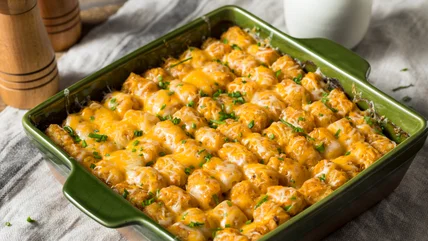 Tater tot casserole is a midwestern delicacy. Usually, a tater tot casserole has a base of ground beef, canned vegetables, and canned cream soups, topped with a layer of tater tots forming a golden potato "crust." It's a cozy, hearty meal invented by farmwives during the Great Depression when affordable, filling food that could be prepared in large portions was vital. The dish grew in popularity and evolved, becoming a popular addition at potlucks, dinner parties, and other community events. The first recipe for a casserole or "hotdish," as it is formally known in its home state of Minnesota, can be found in a community cookbook from the 1930s.