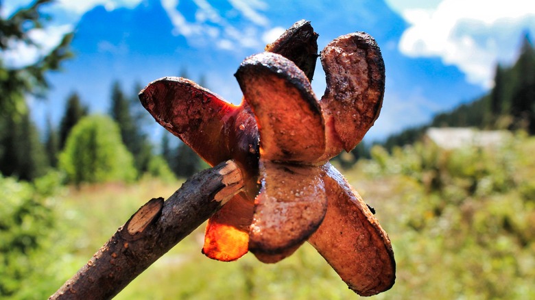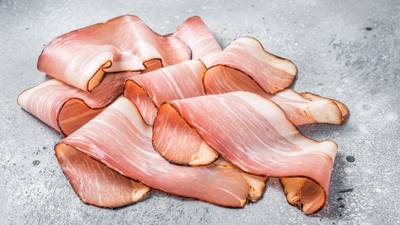 Few cured meats are quite so beloved as bacon in the U.S., and for die-hard fans, there can be no substitute. However, there is a contender for an alternative option in the form of smoky speck. From the German word meaning "fat" or "thick," the meat hails from the South Tyrol province of Italy. It's rich in flavor thanks to the tasty fat that runs through it and has smoky notes that match the familiar flavor we all love, though there are enough differences between speck and bacon to make it interesting.