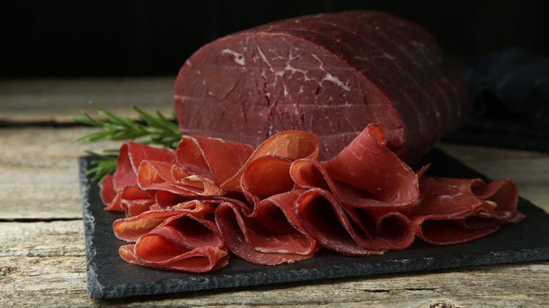 Step aside prosciutto, there's another cured meat on the block, and it's about to level up your deli meat game. Bresaola is an air-dried meat that originated in the Lombardy region of Italy, near the Alps. It's usually made from the topside or silverside of beef, but it can be made with other meats. It's seasoned with a mixture of spices, and then left to cure for 10 days or more, leaving it with a texture similar to prosciutto — but with a more robust flavor.