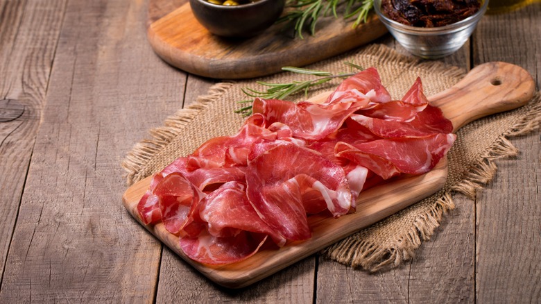 The good news is that bresaola is a leaner cured meat since its fat content is much lower than prosciutto and most salamis. It has a deep red color, which means it looks stunning on a charcuterie platter, too; its slightly sweet flavor makes it perfect for this purpose. If you're looking to switch up your usual meat sandwich, bresaola is a fantastic option. Pair it with sweet tomatoes, fresh arugula, and thin shavings of fresh parmesan for the ultimate umami-rich lunch. Next time you reach for your usual prosciutto, inquire if you can have some bresaola instead and enjoy the deep flavor this lesser-known meat provides.