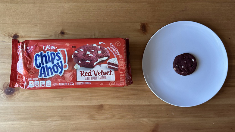 I've never been a huge fan of red velvet anything because it's always kind of felt gimmicky to me. Why would I want something that's just colored with red food dye that has nothing to do with how it actually tastes? But Chip's Ahoy's Chewy Red Velvet cookies made me rethink the way I typically think about red velvet. These cookies are deeply decadent, with a chocolatey flavor that's bold but not quite as intense as the chocolate with chocolate filling cookies. There are also cream cheese chocolate chips in the mix, which may sound strange, but their lightness, in conjunction with the chocolatey flavor of the cookie itself, actually really works here. You'll also notice a white, creamy filling that just adds another layer to the decadence of these cookies.