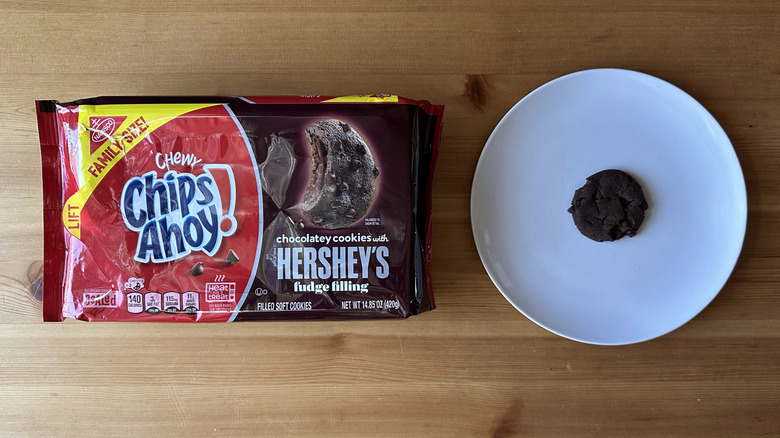 The Chewy Chocolatey Cookies With Hershey's Fudge Filling from Chips Ahoy seems like they would be so similar to the version above, and, of course, structurally, they're basically the same. This is a chocolate chip cookie with a Hershey's chocolate filling, after all. What makes the biggest difference here, though, is the fact that the base of the cookie is also chocolate. That means you get triple chocolate: a chocolate cookie with chocolate chips and a chocolate center.