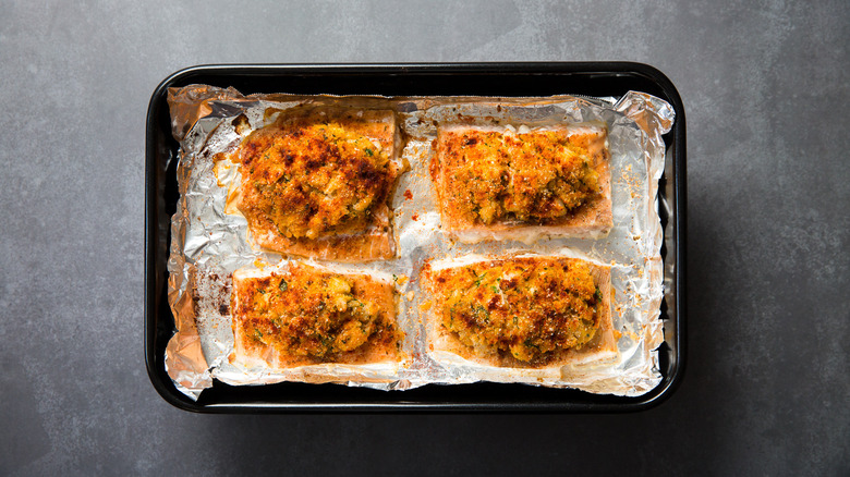 - Pat the salmon filets dry and place them on a foil-lined baking sheet or pan.