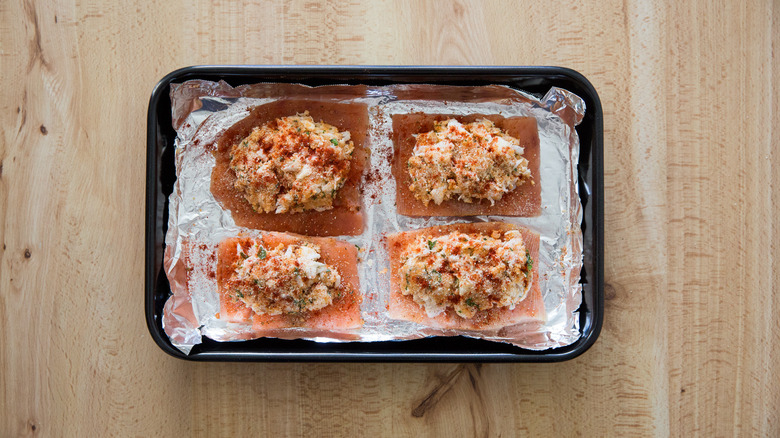 Stuffed fish, like stuffed flounder, salmon, or sardines, is a popular restaurant menu item, but it can also be made at home for a delicious and impressive meal. Stuffed salmon can be made in a variety of ways — it's often served as a creamy dish with spinach and cream cheese — but it can be stuffed with other seafood like crab or shrimp for an elevated touch.