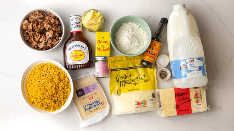 Gather the ingredients for this BBQ pulled pork mac and cheese recipe