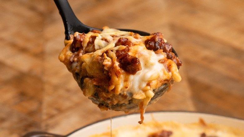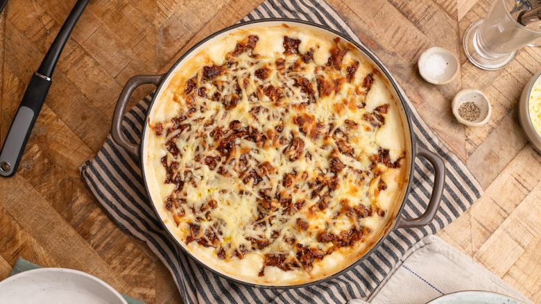 This BBQ pulled pork mac and cheese recipe from the kitchen of recipe developer Jennine Rye takes possibly two of the best dishes known to man — mac and cheese and barbecue pulled pork — and combines them into the ultimate dinnertime feast. The mac and cheese is made using a three cheese combination of cheddar, Gruyère, and mozzarella for a rich, sharp, ultra-stringy, and oozy sauce. To keep things simple, ready-made pulled pork is combined with barbecue sauce and then spread on top of the creamy, cheesy pasta before being baked in the oven until golden and bubbling. Guaranteed to be your new favorite mac and cheese, read on to find out how to whip up this BBQ pulled pork mac and cheese.
