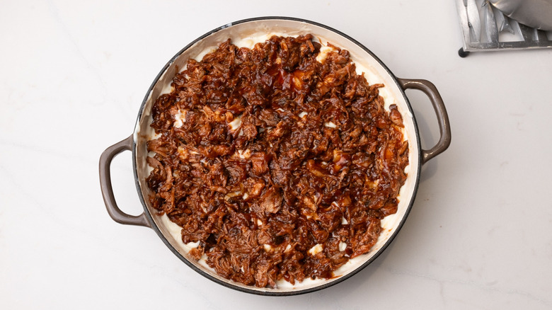 Spread the barbecue pulled pork over the top of the macaroni and cheese.