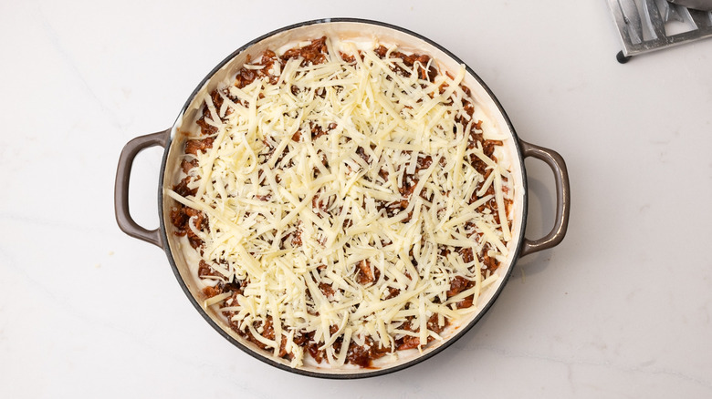 - Add the remaining ½ cup cheddar and ½ cup mozzarella to the top.