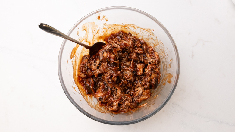 To prepare the pulled pork, mix the shredded pork with the barbecue sauce. Set aside.
