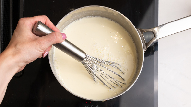 - Add the milk in increments, whisking continuously, until it has all been incorporated.