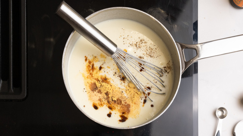 Once the sauce has thickened, add the garlic powder, mustard powder, and Worcestershire sauce.