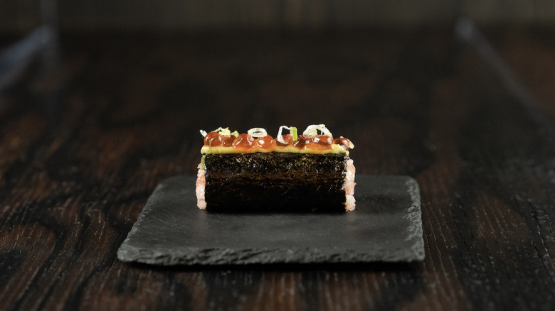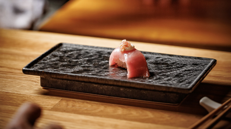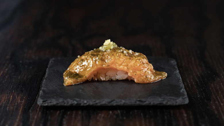 This intentional practice of turning over the piece encourages a moment of mindfulness. Notice the texture and taste of the fish — is it mild and buttery, punchy and umami-rich, smoky after a quick torch, or perhaps tangy from a brush of ponzu glaze? As Sananikone notes, flipping your nigiri also allows the yakumi, or garnish, to reach your tastebuds first. These more nuanced flavors can be overpowered by the sweetness of the sticky rice, so don't overlook this expert tip.