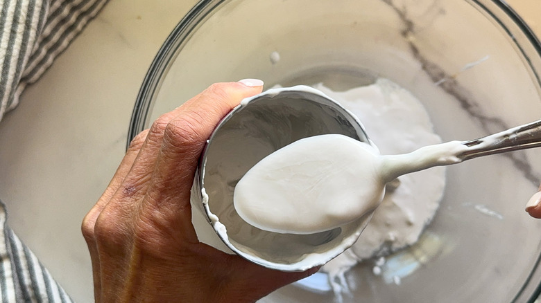 - Scoop out the chunky cream into a bowl as well as thick liquid, and discard the watery liquid.
