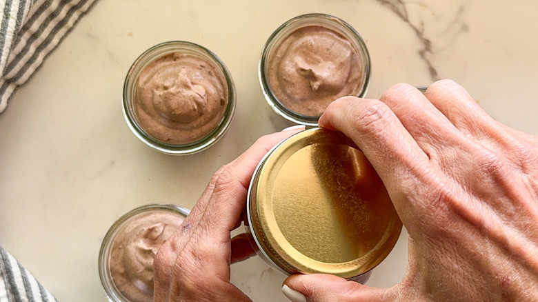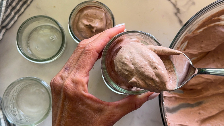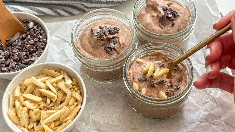 When chilling the mousse, make sure to cover it so it doesn't dry out. If you prefer to use a large container with a lid and distribute it into serving bowls later, that will work fine as well. If you want to portion it out, small 4-ounce jars are very convenient and if serving guests, setting up a topping bar to go with the mousse is a fun idea.