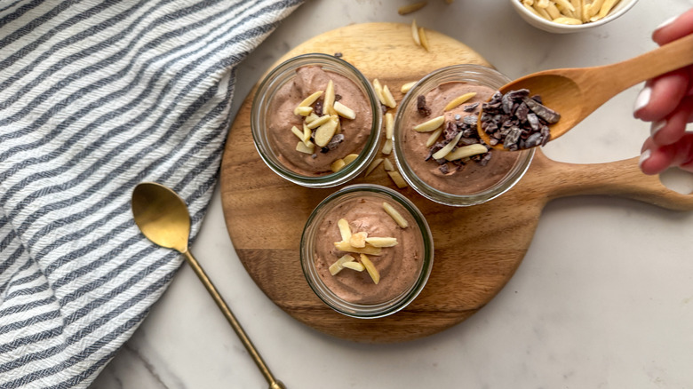 The mousse is ready to serve as is, or topped with optional nuts and cacao nibs as desired.