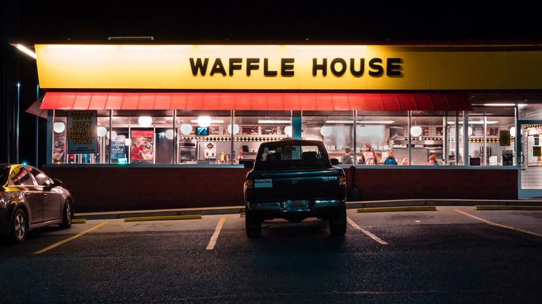 Waffle House's homey atmosphere matches its comforting and satiating menu. In fact, Waffle House was one of Anthony Bourdain's favorite chain restaurants for Southern food, so you can count on a delicious meal any time of the day or night. The first time you visit, you would be remiss not to try a waffle — for instance, the peanut butter chip waffle or the pecan waffle. That said, don't miss out on enjoying other breakfast items like the bacon, egg, and cheese grits bowl or a steaming biscuit slathered in jelly. Not in the mood for breakfast food? No problem. A bowl of chili or a BLT sandwich might satisfy your post-party cravings.