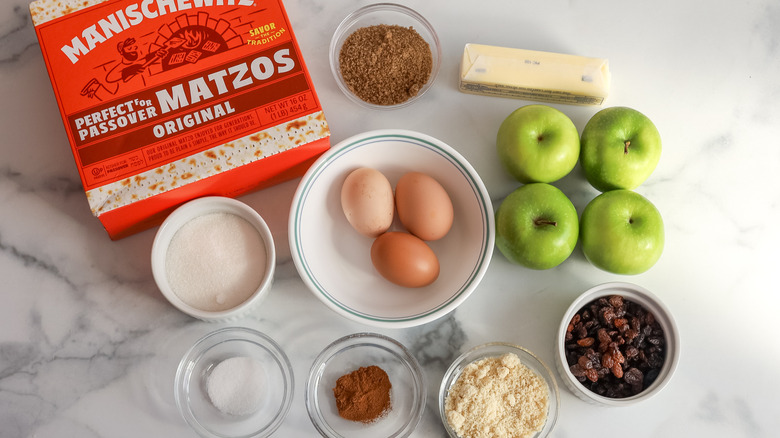 Gather the ingredients for this apple matzo kugel