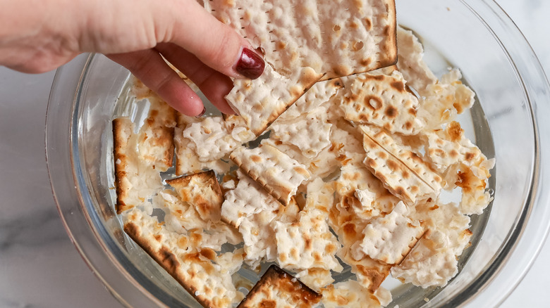 - Break the matzo sheets into pieces and place them in a medium-sized bowl half filled with water. Soak in the water until soft, and set aside.