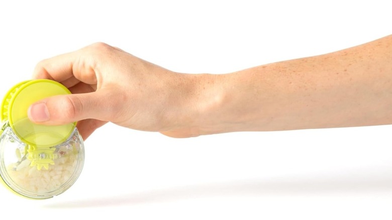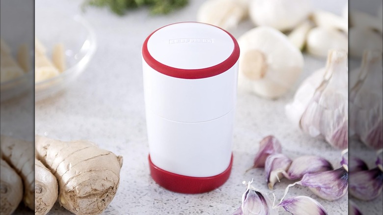 When a recipe calls for minced garlic, there's an easier option than using a chef's knife to tediously chop several cloves: Use the NexTrend garlic twister instead. Insert two or three cloves into the canister and twist it to mince the garlic and release the small pieces — along with the garlic juices — into the base. The minced garlic collects into two triangle shapes within the base, making it easy to remove. You can even use the tool to peel the cloves before mincing them by hitting the base against them. This twisting tool can be used to mince more than just garlic, too; try it with ginger, nuts, and herbs.