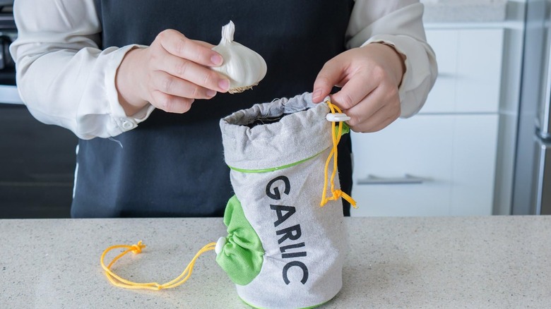 This drawstring bag is made from breathable cotton, which allows for adequate airflow and circulation around each head of garlic. Not only does it offer proper ventilation, but it also helps block out light, keeping the cloves fresher for longer. The bag's design features two drawstrings — one at the top for adding new cloves and one at the base — to encourage you to use the older heads first.