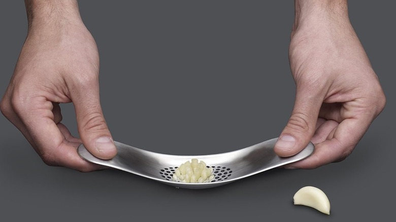 While it may look simple, you'll be impressed with the performance of the Joseph Joseph garlic rocker. The stainless steel tool features a flat base with several holes. You can place the holes over a peeled garlic clove and use the two handles to rock it back and forth. Then, scrape the garlic into the pot or mixing bowl. Your hands won't need to touch the minced garlic at any point during the process, helping to keep them from absorbing the pungent odor. Once you've finished working, you can pop the rocker straight into the dishwasher.